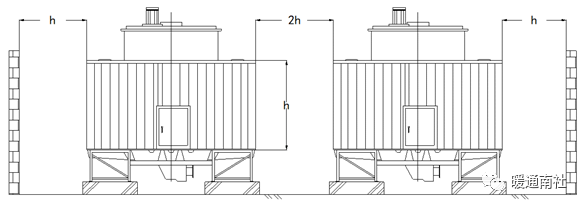 风机位于冷却塔正中,填料位于两侧,因此飘水量较少。无水雾形成。