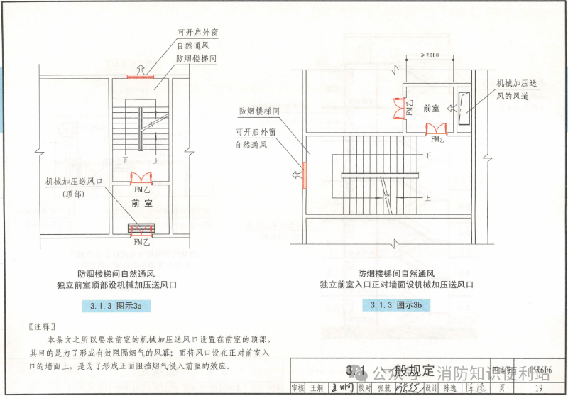 注:规范条文中并未要求机械加压送风口安装在前室的顶部,但图集上标注在前室顶部。将前室的机械加压送风口设置在前室的顶部,其目的是为了形成有效阻隔烟气的风幕。