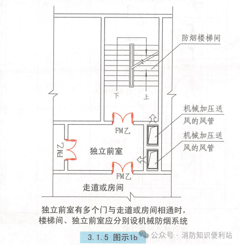 3、建筑高度≤50m的公共建筑、工业建筑和建筑高度≤100m的住宅建筑,当独立前室有多个门时,楼梯间、独立前室应分别独立设置机械加压送风系统。