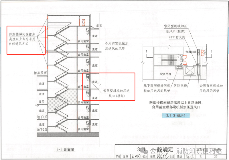 图集20K607:建筑地下部分的防烟楼梯间前室及消防电梯前室,当局部具备自然通风条件时,可采用自然通风系统。