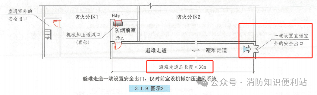 1、避难走道一端设置安全出口,且总长度小于30m;
