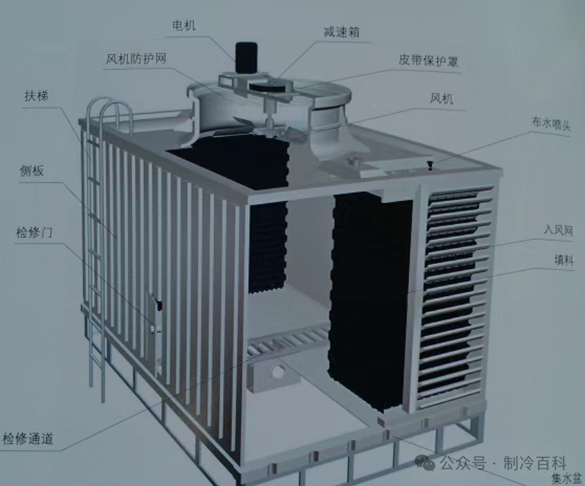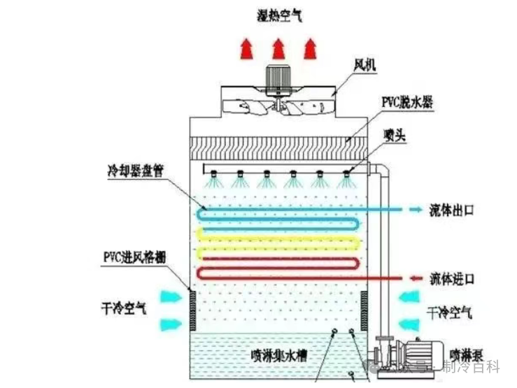 外循环:喷淋水从盘管上方喷淋,在盘管外表面形成水膜,与下方流动的空气进行热交换(蒸发散热),冷却后的喷淋水落入塔底循环使用,属于“间接冷却”系统。