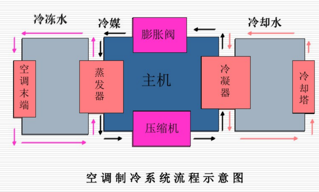 冷却塔:冷却塔是用于将冷却水降温的设备,它通过水与空气的接触,将冷却水中的热量散发到空气中。冷却水从冷却塔的顶部喷淋而下,与从底部进入的空气进行热交换,水温降低后流回冷却水池,再由冷却泵输送到制冷机的冷凝器。