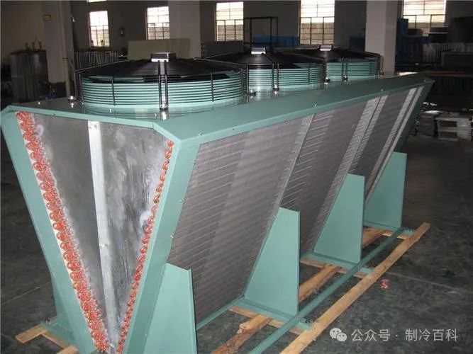 空气冷却式冷凝器:冷凝器中制冷剂放出的热量被空气带走,制冷剂在管内冷凝。这种冷凝器中有自然对流空气冷却式冷凝器和强制对流空气冷却式冷凝器。通常,空气冷却式冷凝器也叫风冷冷凝器。