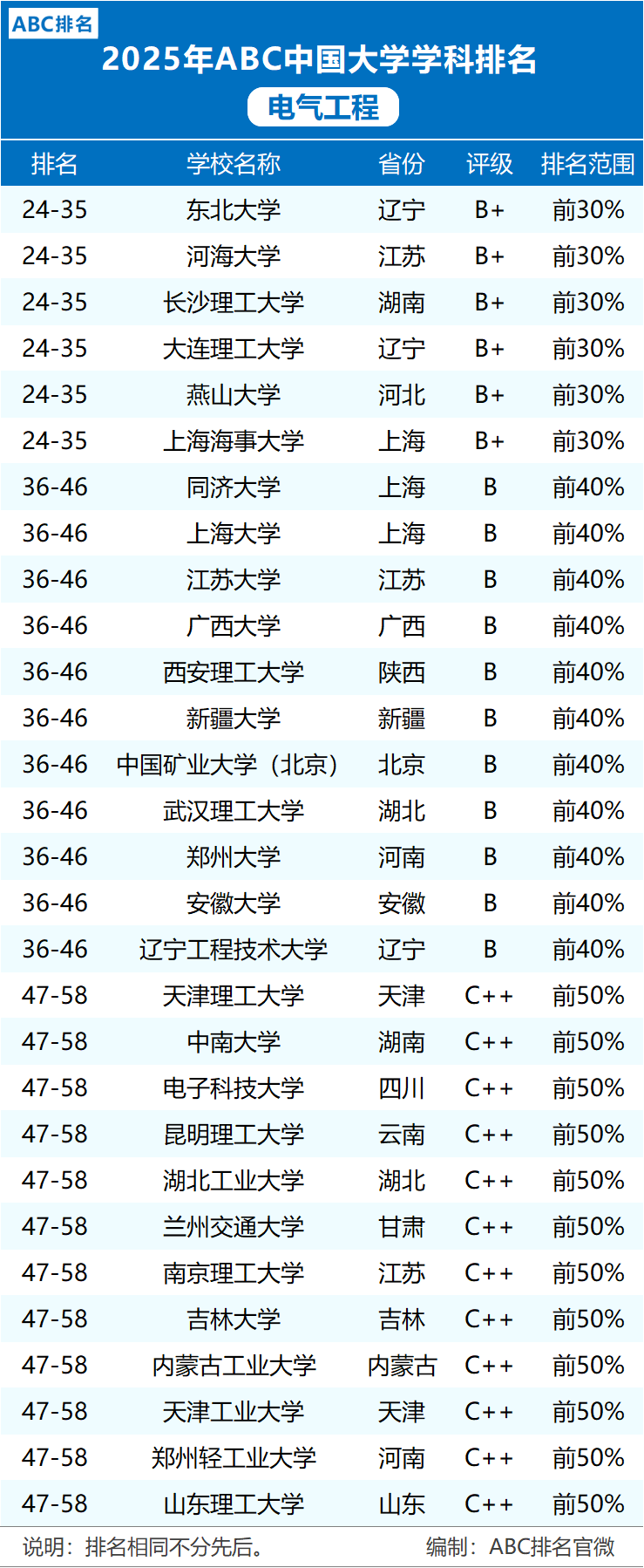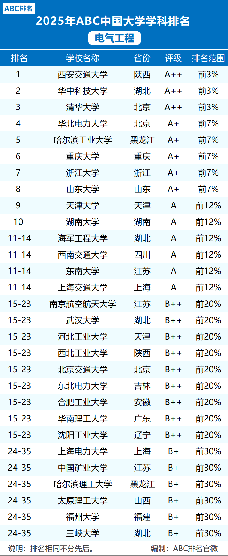 2025年中国大学电气工程学科最新排名! 发布: 2025 年 6 月 17 日 160阅读 近日,中国大学排行榜(CNUR)网站正式发布了《ABC排名系列榜单:2025年ABC中国大学电气工程学科排名》,共58所院校上榜! 排名结果显示,2025年ABC中国大学电气工程学科排名前十依次为: 西安交通大学(A++,前3%)、 华中科技大学(A++,前3%)、 清华大学(A++,前3%)、 华北电力大学(A+,前7%)、 哈尔滨工业大学(A+,前7%)、 重庆大学(A+,前7%)、 浙江大学(A+,前7%)、 山东大学(A+,前7%)、 天津大学(A,前12%) 湖南大学(A,前12%)。 附图 2025年ABC中国大学电气工程学科排名 2025年电气工程一级学科开设院校共116所,比第四轮学科评估参评院校多32所;具有“博士授权”的高校共53所,比2017年增13所,其中2023年度审核增列6所;另外,该学科入选国家“双一流”建设行列的高校共7所(除北京大学、清华大学外)。 本文来自网络,不代表机电天下立场,转载请注明出处:https://mepbbs.com/archives/17800 标签:电气工程学科