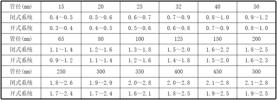 管内水流速推荐值(m/s)