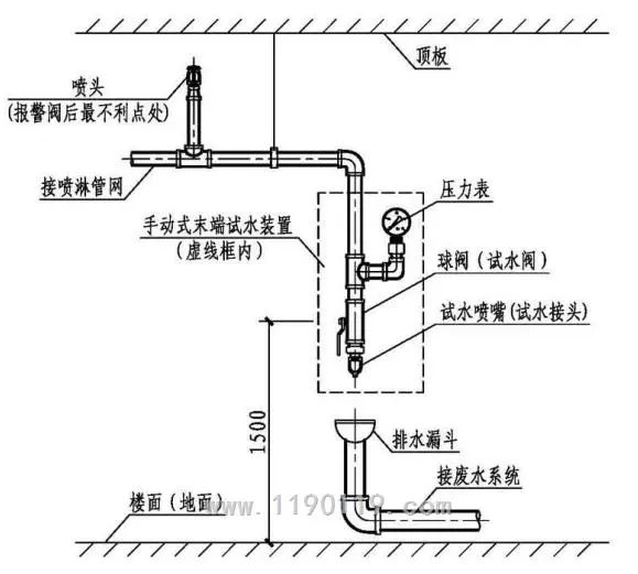 末端试水装置:由试水阀、压力表、试水喷嘴及保护罩等组成,用于监测自动喷水灭火系统末端压力,并可检验系统启动、报警及联动等功能的装置。