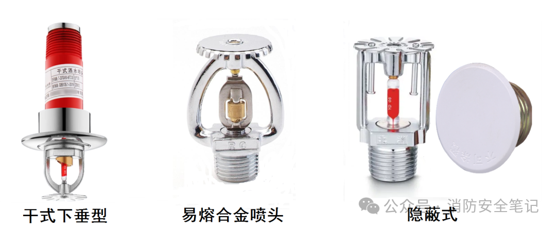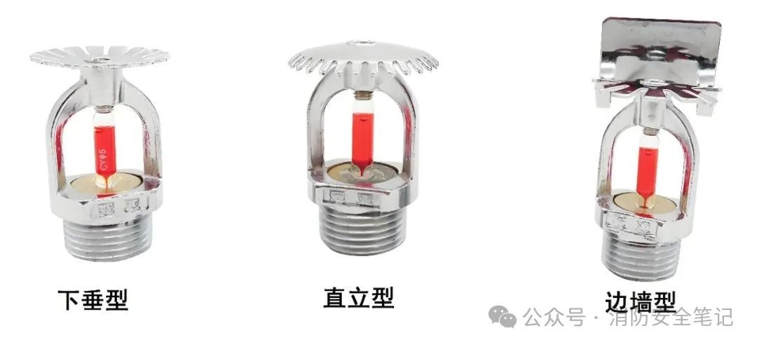 洒水喷头:按设计的洒水形状和水量洒水的装置,由于热的作用,在预定的温度范围内自行启动,分为玻璃球洒水喷头和易熔元件洒水喷头。按安装位置分类又分为:边墙型洒水喷头、下垂型洒水喷头 、直立型洒水喷头、干式洒水喷头、隐蔽式洒水喷头、齐平式洒水喷头、嵌入式洒水喷头等。