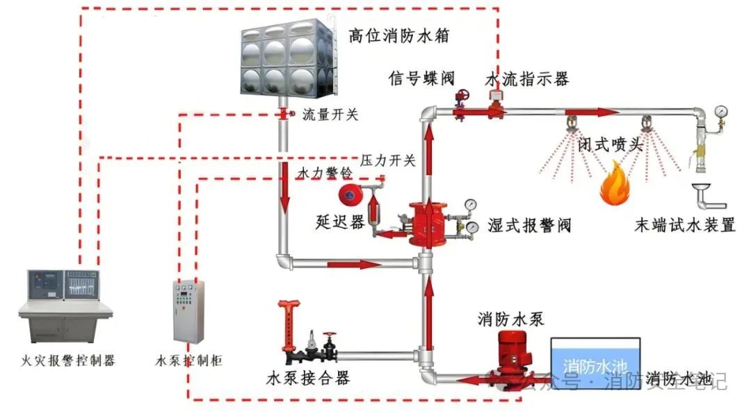 湿式自动喷水灭火系统是由洒水喷头、湿式报警阀组、水流报警装置(水流指示器或压力开关)等组件,以及管道、供水设施等组成,准工作状态时配水管道内充满用于启动系统的有压水,能在发生火灾时喷水的自动灭火系统。