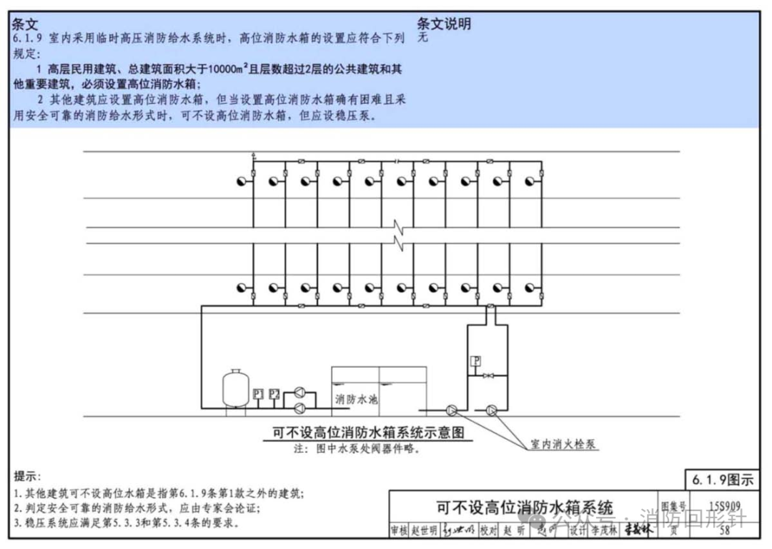 当不设置高位水箱时,图集做法如下:15S909《消防给水及消火栓系统技术规范》