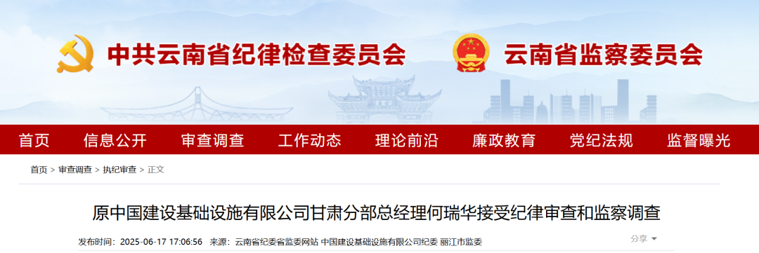 据中国建设基础设施有限公司纪委、丽江市监委6月17日消息:原中国建设基础设施有限公司甘肃分部总经理何瑞华涉嫌严重违纪违法,目前正接受中国建设基础设施有限公司纪委纪律审查;经国家监委指定云南省监委管辖,云南省监委指定丽江市监委管辖,正接受丽江市监委监察调查。