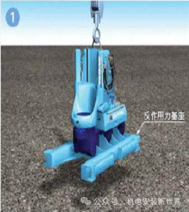 对钢板桩施工场地进行平整,使整平度符合施工要求,采用25t吊车将静压植桩机的中心点置放于反力基座上,使用夹具夹紧反力基座。