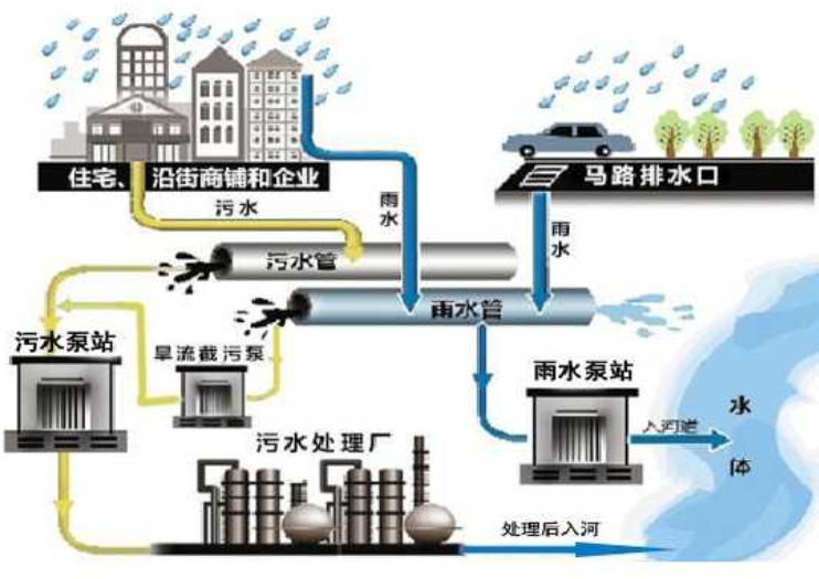 在合流制排水系统中,生活污水和雨水共同进入合流管,经合流泵站输送后进入污水处理厂处理后排入河道。