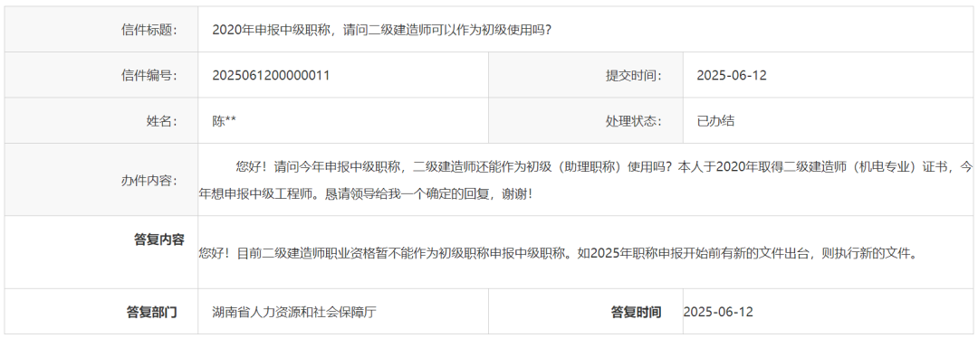 此外,湖南省人社厅也明确二级建造师职业资格暂不能作为初级职称申报中级职称。
