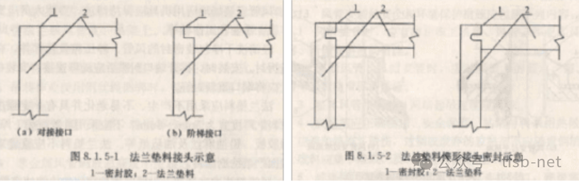 (4)法兰垫料的接口形式符合以下规定,普通风管采用对接接口和梯形接口(图8.1.5-1),应在对接部位涂密封胶;洁净空调系统风管的法兰垫料接口应采用阶梯形或榫型(图8.1.5-2),并涂抹密封胶。