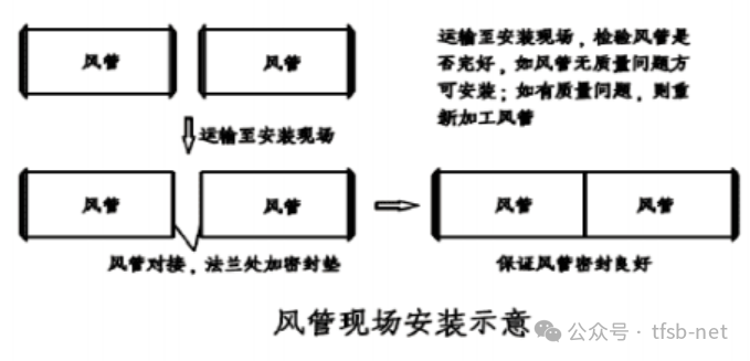 ● 风管安装时,根据施工现场情况,可以在地面连成一定长度,采用吊装的方法就位,也可以把风管一节一节地放在支架上逐节连接。