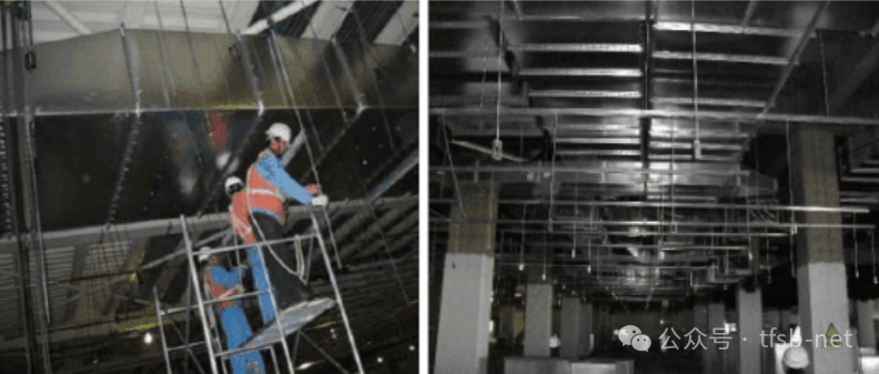 ● 吊架安装完毕,经确认位置、标高无误后,将风管和部件按编号预排。