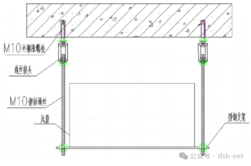 ● 采用M10的外膨胀螺丝使风管支架的吊点或支撑点与建筑结构固定。