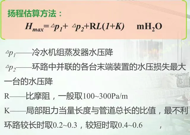 水泵扬程应为承担的供回水管网最不利环路的总水压降的1.1~1.2倍。