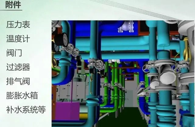 在空调的冷冻水系统中,它的主要构成是水管系统以及水泵还包括各种的附件,如:压力表、温度计、阀门、过滤器、排气阀、膨胀水箱以及它的补水系统等。