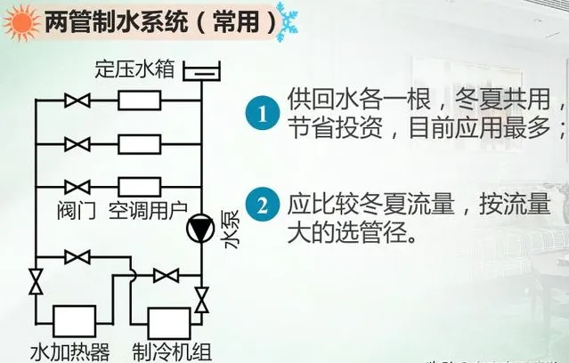 在同程式中,增加了一个主要的总回水管,所以在同程式中,各个用户的环路相等,阻力易于平衡,建议采用。在异程式中,我们的每一个用户走的路程是不一样的,所以我们一般在小型的系统中可以选择这种异程式。同程式系统增加了总回水管,所以它的造价会相应地提高一些。在空调冷冻水系统中呢,根据管路冬夏是否共用,可以分为两管制、三管制和四管制。