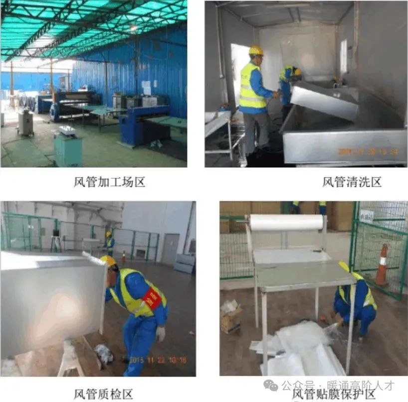加工场地应包含风管加工区,风管清洗区,风管质检区,风管密闭区,清洗并密闭好的风管的库存区。