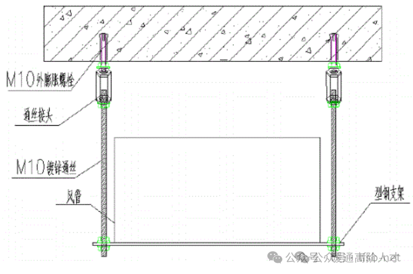 ● 采用M10的外膨胀螺丝使风管支架的吊点或支撑点与建筑结构固定。