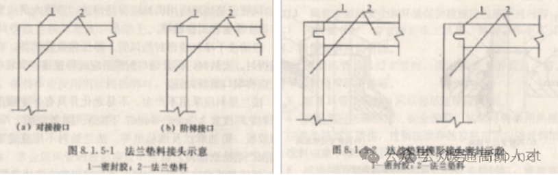 (4)法兰垫料的接口形式符合以下规定,普通风管采用对接接口和梯形接口(图8.1.5-1),应在对接部位涂密封胶;洁净空调系统风管的法兰垫料接口应采用阶梯形或榫型(图8.1.5-2),并涂抹密封胶。