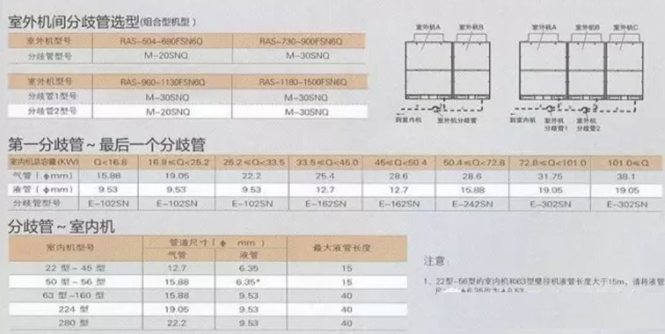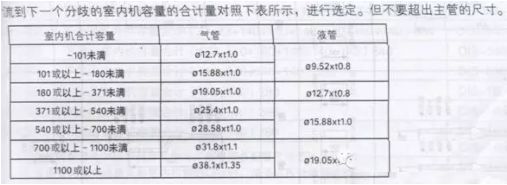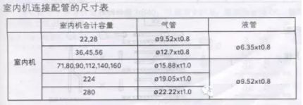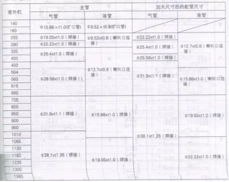 1)室外机容量在255~960时,最长从(室外机到最远的室内机)在90m以上时,一定将气侧、液侧的主管尺寸加大。