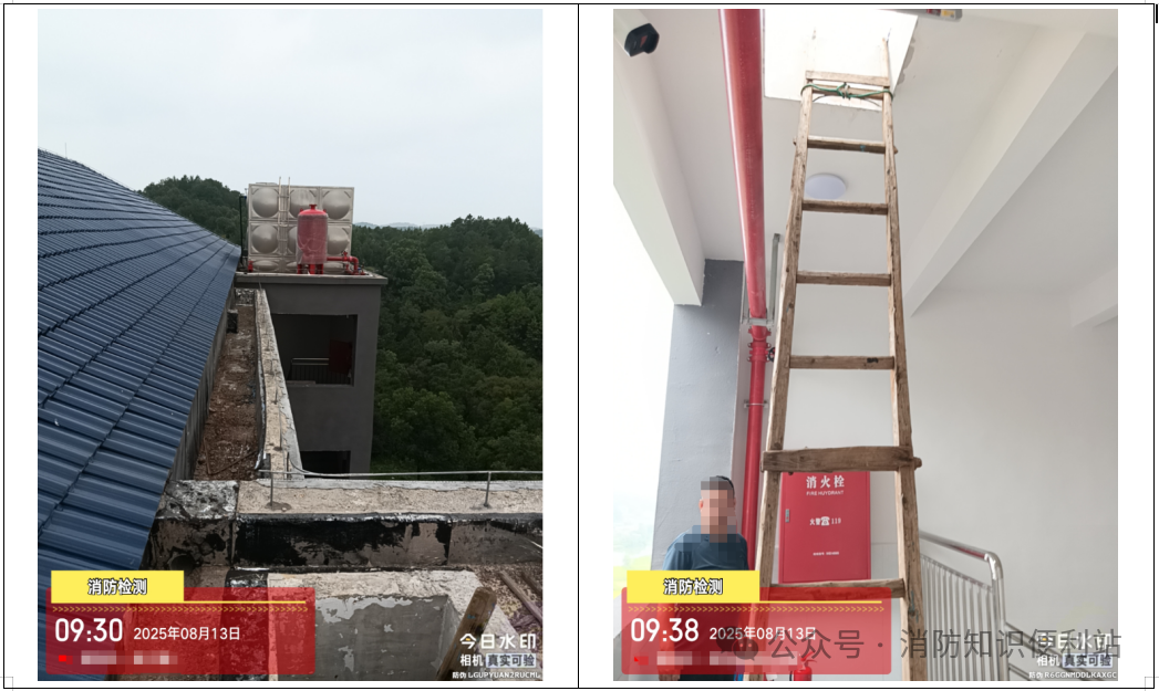 如图所示,该项目将高位消防水箱设置在屋面上。然而,通往该不上人屋面的通道,仅采用安全可靠性极低的自制木梯(通过检修口攀爬),且屋面临边位置未设置任何防护栏杆。这样设置是否满足规范要求呢?
