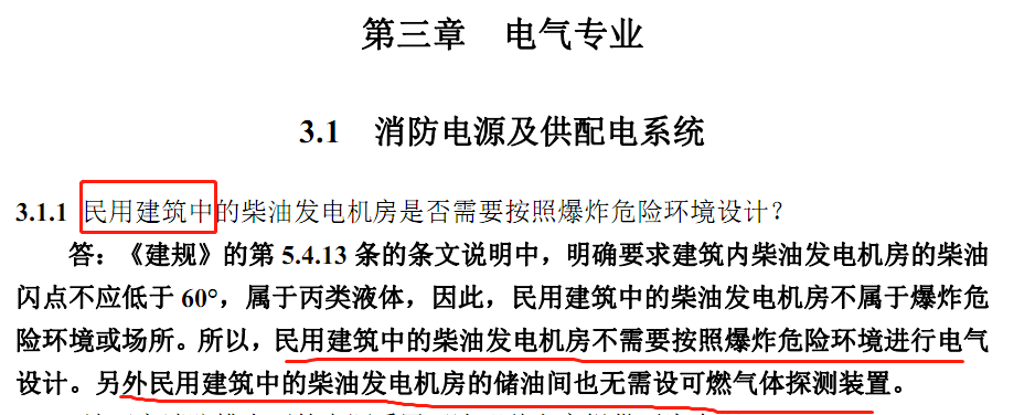 根据《爆炸危险环境电力装置设计规范》GB 50058- 2014,目前自备柴油发机组使用闪点大于60℃的柴油,故日用油箱间划为非爆炸危险场所。