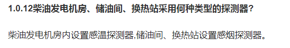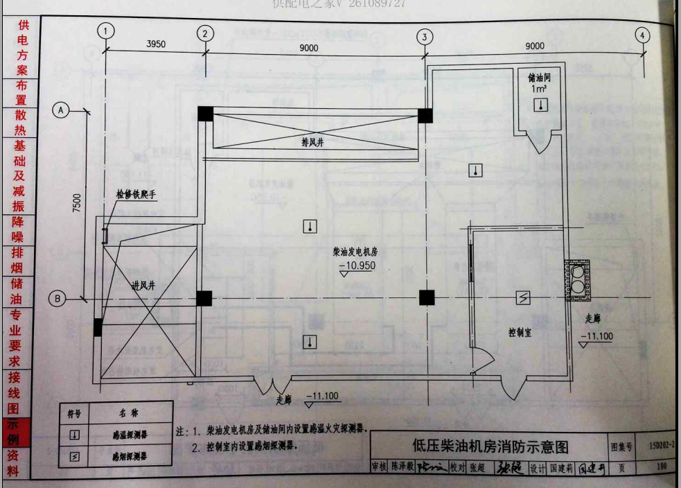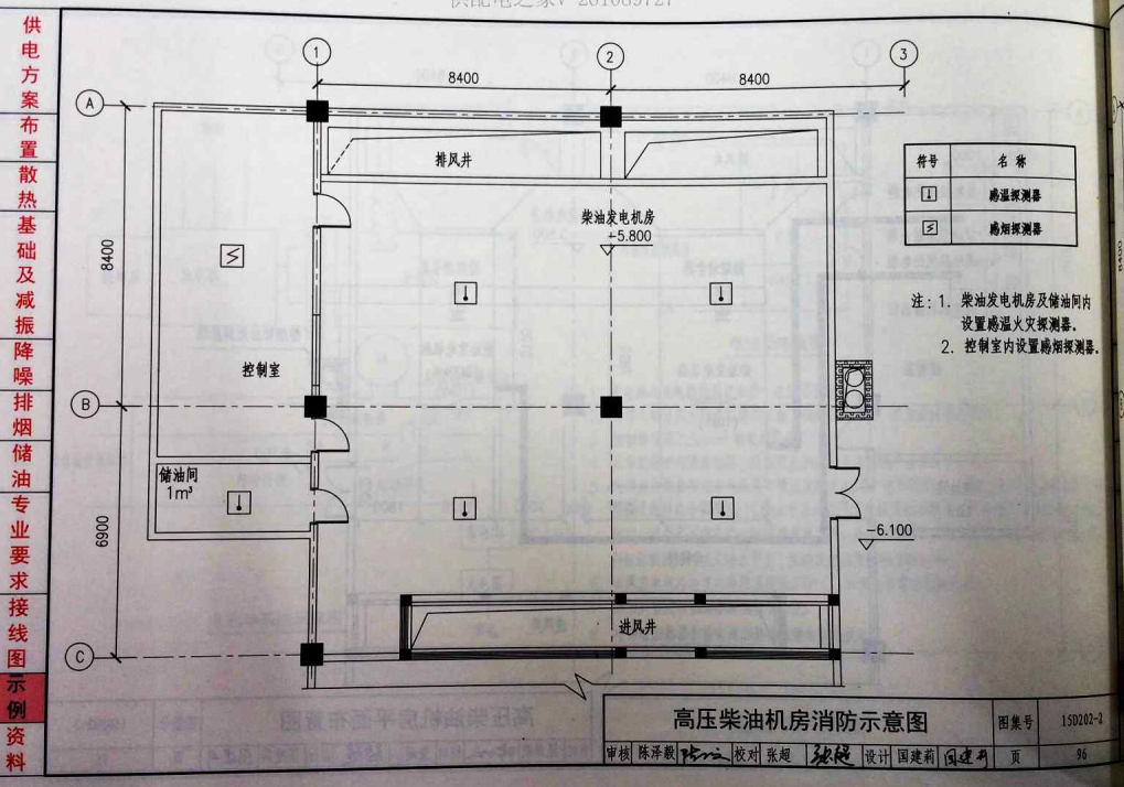 3.3 15D202-2《柴油发电机组设计与安装》图集第96页和100页,发电机房及储油间采用感温火灾探测器,控制室采用的是感烟探测器。
