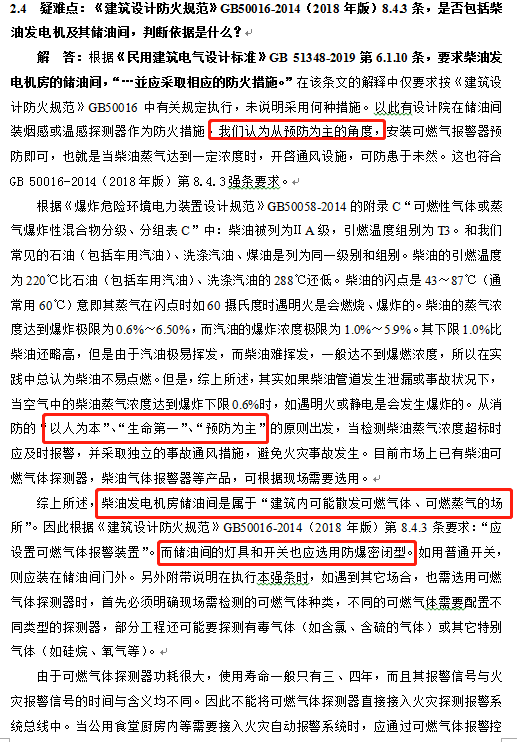 但在随后的2022年,湖北省里文件《湖北省建设工程消防设计审查验收疑难问题技术指南(2022年版)》中明确了:柴油发电机房及其储油间不属于“建筑内可能散发可燃气体、可燃蒸气的场所”,可不设置可燃气体浓度探测。