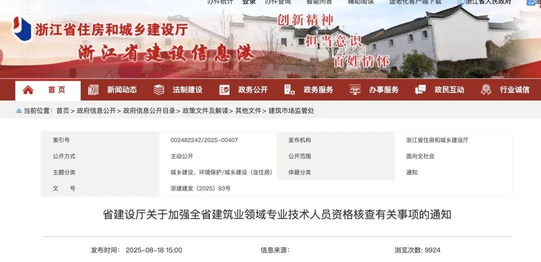 为坚决遏制建筑业领域“挂证”乱象,切实维护企业和从业人员合法权益,规范建筑市场秩序,近日,浙江省住房和城乡建设厅印发《关于加强全省建筑业领域专业技术人员资格核查有关事项的通知》,从职称管理、入库审核、企业责任到违规查处全链条发力,为全省建筑业专业技术人员资格管理戴上“紧箍咒”。