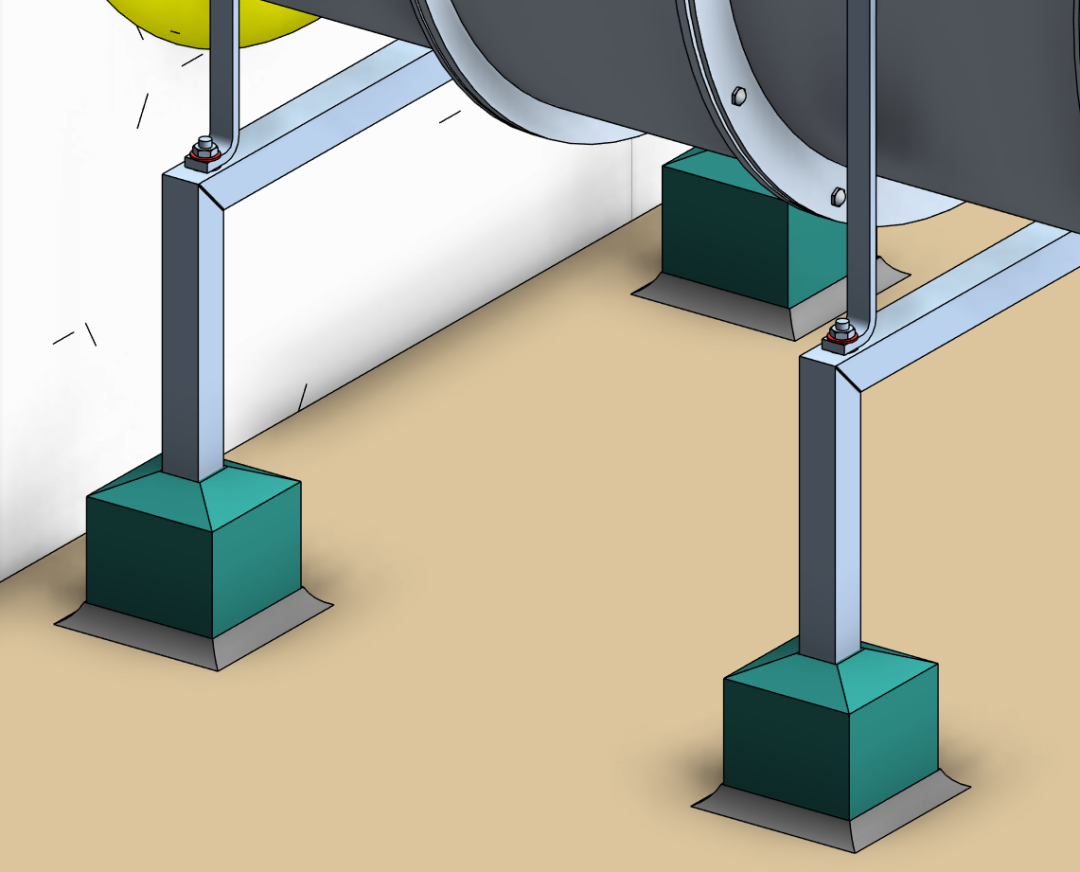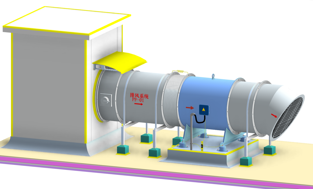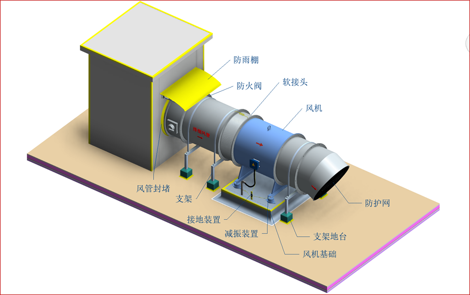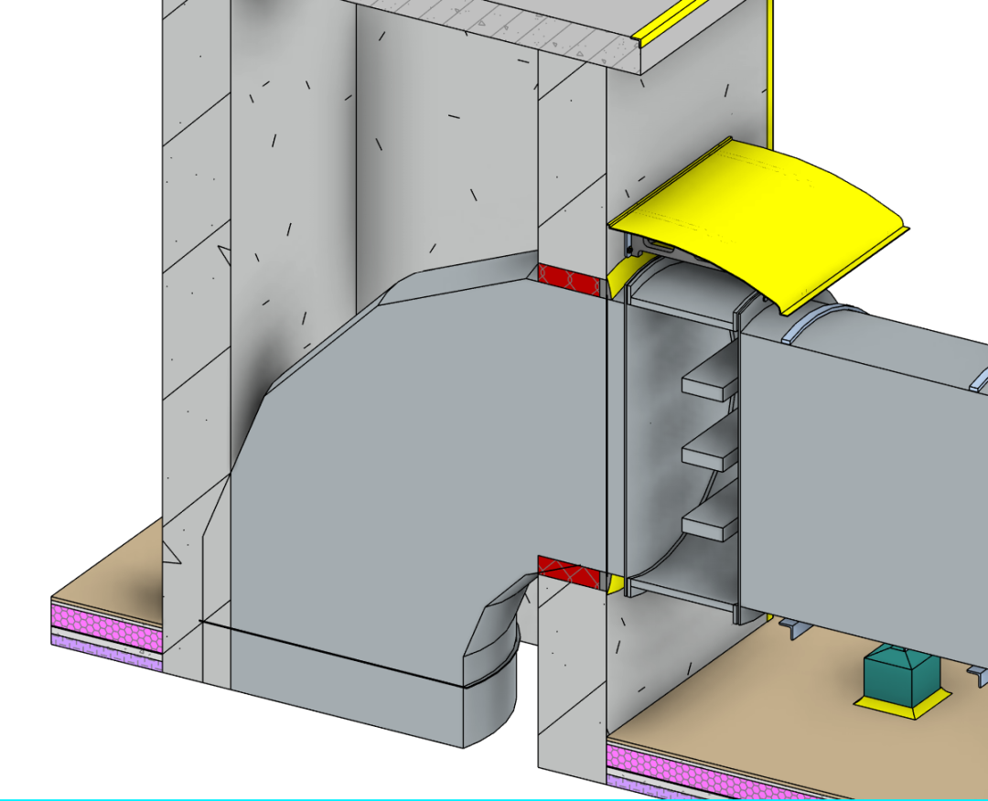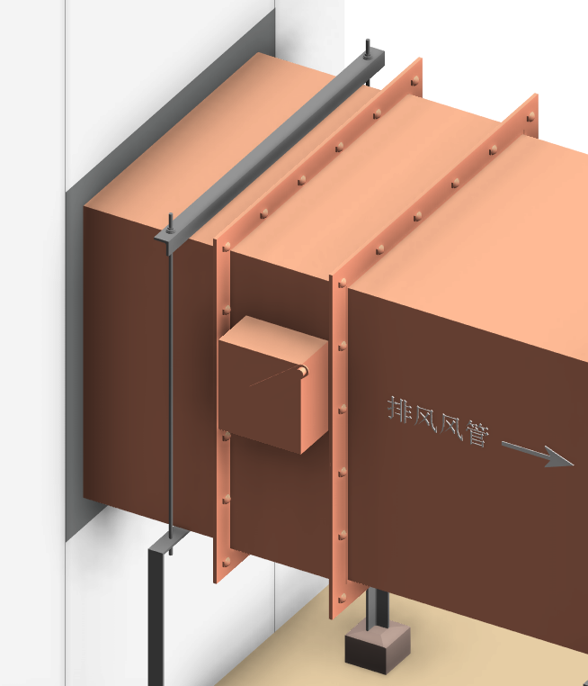 风机系统安装BIM节点大样图 5.风管及阀部件安装 (1)风阀调节机构及风管进出户位置应安装挡雨装置。 风机挡雨装置示意图 (2)设备与风管之间需采用柔性连接,两边法兰应平行,不错位,柔性连接管长度在150~300mm之间。设备进出口应安装镀锌钢丝网做好防护。 风机软接头、防护网安装示意图 (3)风管连接时,法兰螺母应在同一侧,且螺丝长度应一致,所有固定螺栓应安装螺帽。风管法兰垫料厚度宜为 3~5 mm,垫料与法兰平齐,不得挤入管内。 法兰连接螺栓方向、长度一致 (4)风管穿越墙体时风管外壁与结构之间空隙采用50mm厚不燃材料填实,建筑装饰面使用水泥砂浆或与风道面层装饰相匹配的材料收口,封堵严密。 风管穿越墙体收口 6.配电及防雷接地 (1)热镀锌导管的位置敷设于设备电源侧,其出地面的高度相对于设备电源端等高。 配电及防雷接地示意图 (2)电源金属导管管口处装设防水弯头,加装防液柔性金属软管引入设备电源端,长度不应大于0.8m,两端采用专用锁扣锁紧。 (3)接地线预留预埋在风机设备电源金属导管同一侧,接地线热浸镀锌扁钢双孔及以下应100mm,双孔以上高应200mm。 防水弯头 接地线连接示意图 (4)热镀锌导管、支架、电动设备及电动执行机构的外露可导电部分、通风管道及其软接处等就近、分别与保护导体可靠连接,采用螺栓连接,镀锌平光垫和弹簧垫齐全。 (5)接地连接线应采用绿黄双色铜芯绝缘软导线,留有余量,截面不小于4mm2。 7.标识及其他 (1)标识喷漆前管道表面应清理干净、干燥。采用自喷漆时,喷涂应防止污染,周围应保护到位。设备标识应固定牢固,高度合理。风机标识宜设置在设备侧面。成排设备的标识位置应一致,且应朝同一方向,高度应一致; 标识喷漆示意图 (2)系统贯通并经自检合格、正式水电条件具备后,完成设备单机试运行工作。风机叶轮旋转方向应正确、运转应平稳、应无异常振动与声响,电机运行功率应符合设备技术文件要求。在额定转速连续运转2h后,轴承温升正常。