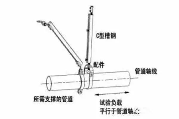 向支撑配件加荷载试验,侧向支撑试验荷载在施加时应垂直于受支撑的管道轴线,纵向支撑试验荷载在施加时应平行于受支撑的管道轴线。详见下图。