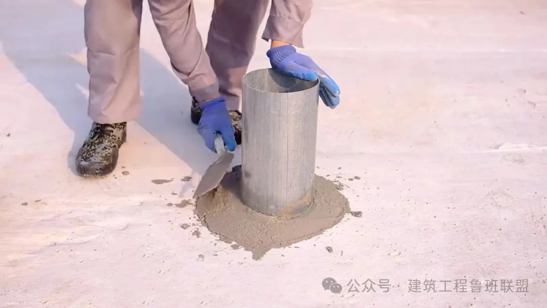为防止套管根部积水,在根部用水泥砂浆抹出高度大于30mm坡向周围的圆锥台,套管与圆锥台交接处预留20*20mm凹槽,用密封材料嵌填密实。