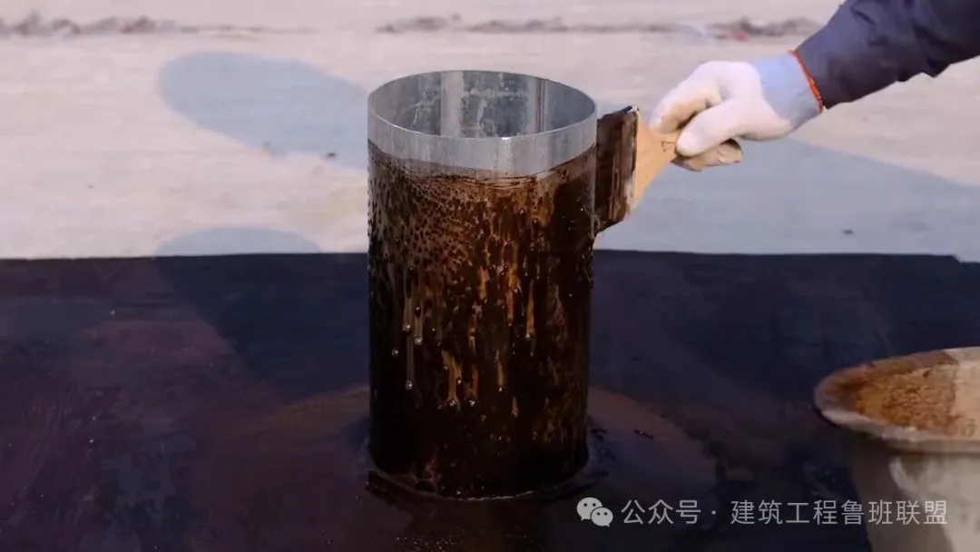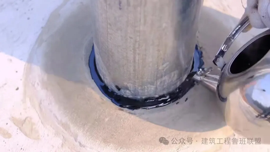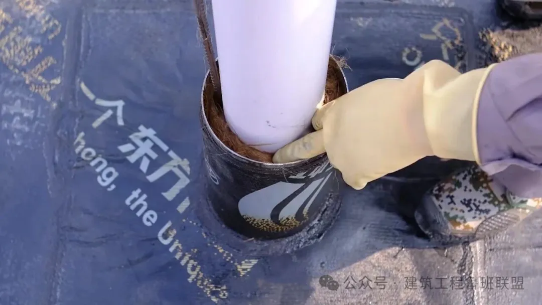 套管与出屋面管道之间的缝隙用浸油沥青麻丝捻成长条状,细铲填塞密实,选用专用密封胶或沥青油膏等有一定收缩性的材料进行封口。