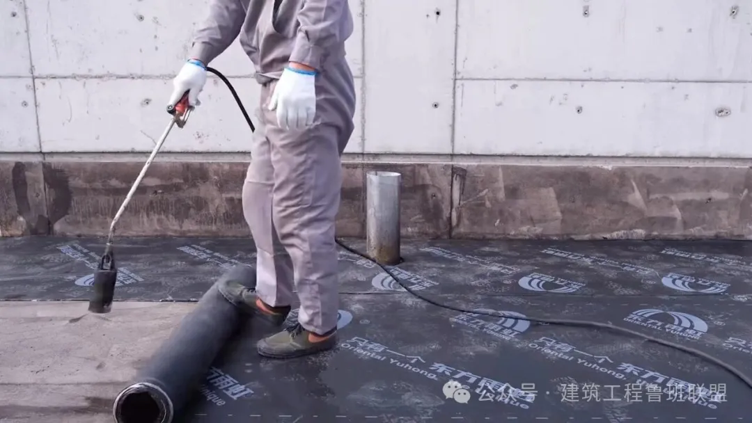 防水面层施工时,卷材搭接缝部位热熔处理前,先将卷材表面的隔离层融化,搭接缝热熔以溢出热熔的改性沥青为控制度,趁卷材尚未冷却时,用小平铲封刮接口,再用喷灯均匀细致密封。