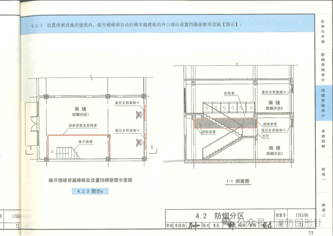 敞开楼梯间开口处是否应设置挡烟垂壁? 发布: 2025 年 9 月 15 日 123阅读 规范要求 根据《 建筑防烟排烟系统技术标准》 GB51251-2017 4.2.3 设置排烟设施的建筑内,敞开楼梯和自动扶梯穿越楼板的开口部应设置挡烟垂壁等设施。 图集要求如下: 注意这里,要求的是敞开楼梯,不是敞开楼梯间。 敞开楼梯和敞开楼梯间区别如下,根据规范组的回复: 总结就是:敞开楼梯上下层为一个防火分区,敞开楼梯间上下层不同的防火分区。 《建筑防火通用规范》GB55037-2022 4.1.2 建筑内竖向按自然楼层划分防火分区时,除允许设置敞开楼梯间的建筑外,防火分区的建筑面积应按上、下楼层中在火灾时未封闭的开口所连通区域的建筑面积之和计算; 结论 规范要求:一般敞开楼梯间的开口是不用设置挡烟垂壁的。 如下图: 个人理解:但是敞开楼梯间的开口开向需要设置排烟场所的地方,譬如大于20m的走道的时候,不设置挡烟垂壁的情况下,烟气会通过走道蔓延,应该设置挡烟垂壁。 如下图: 本文来自网络,不代表机电天下立场,转载请注明出处:https://mepbbs.com/archives/20335 标签:挡烟垂壁