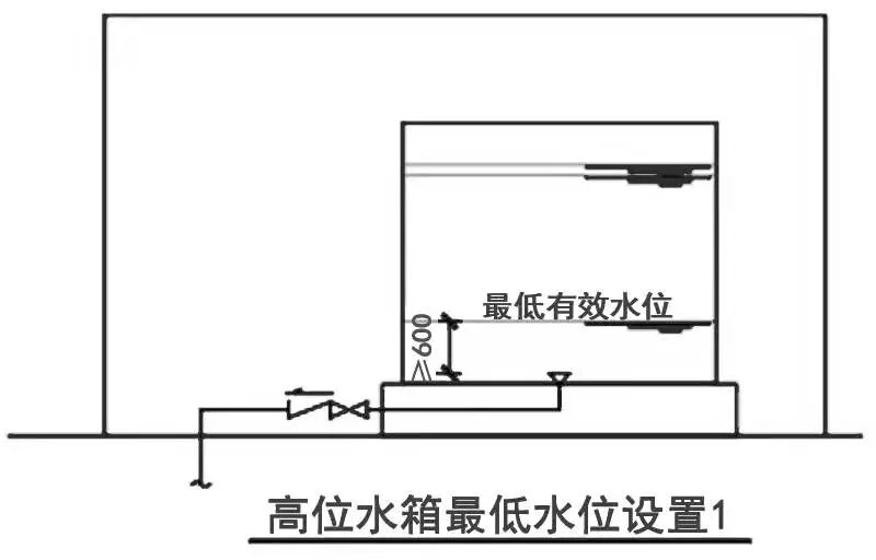 出水管管径应满足消防给水设计流量的出水要求,且不应小于DN100,值得注意的是出水管应位于高位消防水箱最低水位以下,并应设置防止消防用水进入高位消防水箱的止回阀,同时,进、出水管应设置带有指示启闭装置的阀门。