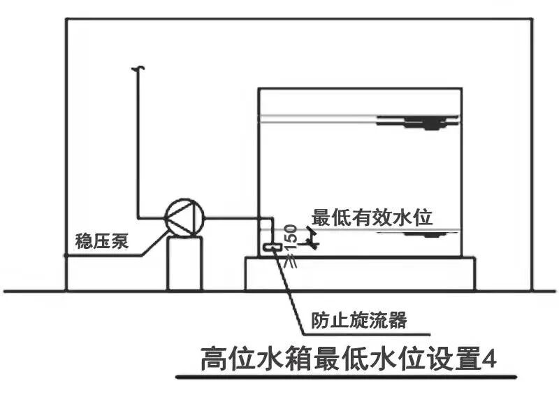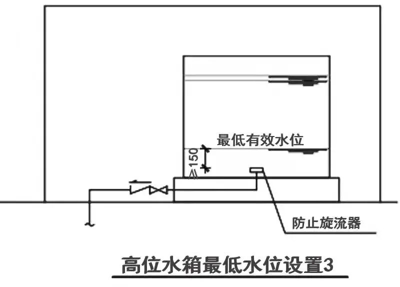 值得注意的是,有一些施工单位未按设计要求安装旋流防止器。旋流防止器物件虽小,却是提高消防水箱有效利用率,保证消防水箱有效容积能被全部利用的重要组成。