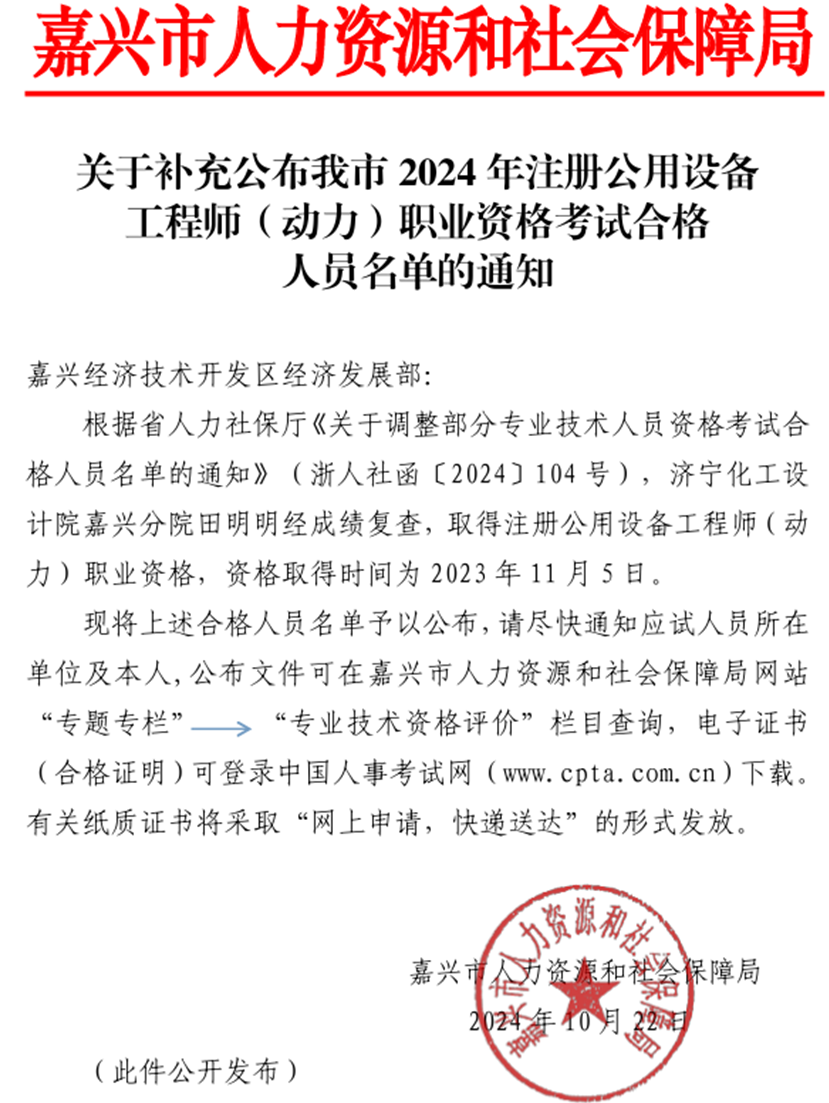 破天荒!成绩复核通过! 发布: 2025 年 9 月 24 日 212阅读 近日,嘉兴市人力资源和社会保障局发布《关于补充公布我市2024年注册公用设备工程师(动力)职业资格考试合格人员名单的通知》。 通知中提到,来自济宁化工设计院嘉兴分院的考生田明明,通过成绩复查程序,成功取得了注册公用设备工程师(动力)职业资格,获证时间追溯至2023年11月5日。 本文来自网络,不代表机电天下立场,转载请注明出处:https://mepbbs.com/archives/20438 标签:成绩复核
