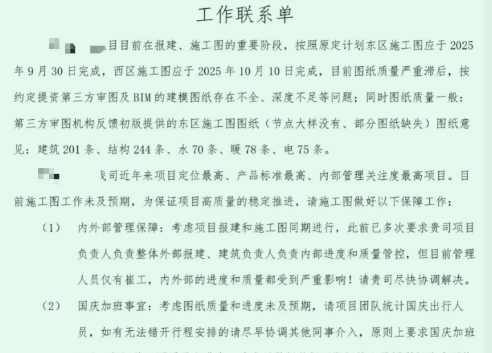 某某项目目前在报建、施工图的重要阶段,按照原定计划东区施工图应于2025年9月30日完成,西区施工图应于2025年10月10日完成,目前图纸质量严重滞后(问:质量咋滞后?太重了吗?),按约定提资第三方审图及BIM的建模图纸存在不全、深度不足等问题;同时图纸质量一般:第三方审图机构反馈初版提供的东区施工图图纸(节点大样没有、部分图纸缺失)图纸意见:建筑 201条、结构244条、水 70条、暖 78 条、电 75 条。