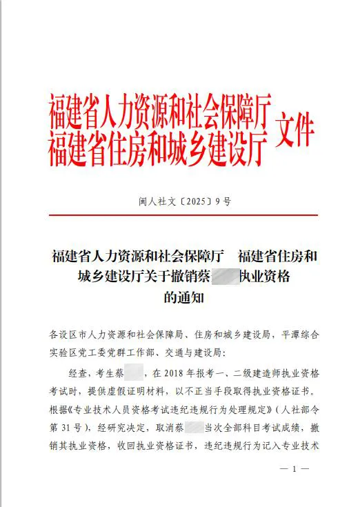 1月20日,福建人社厅官网消息:福建人社厅、住建厅联合发文,撤销了一位考生2018年考取的一级建造师+二级建造师证书。