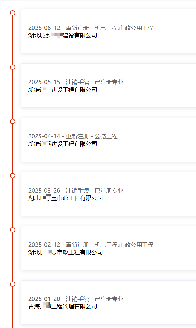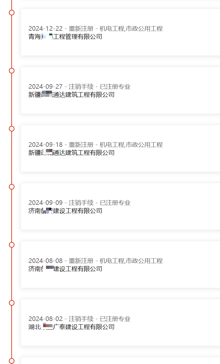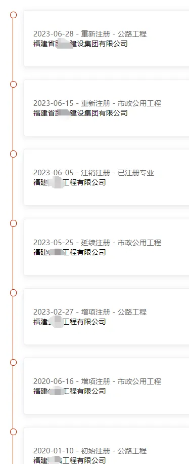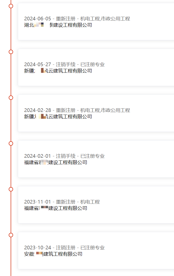 通过查询这位考生的注册信息可知,该名考生的确存在“挂证”的嫌疑,其证书注册变更有21条记录,注册过的公司有11家,间隔最短的不足一个月时间,最近的一次注册成功是6月12日。
