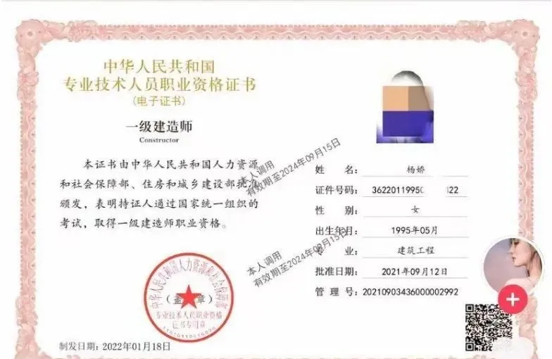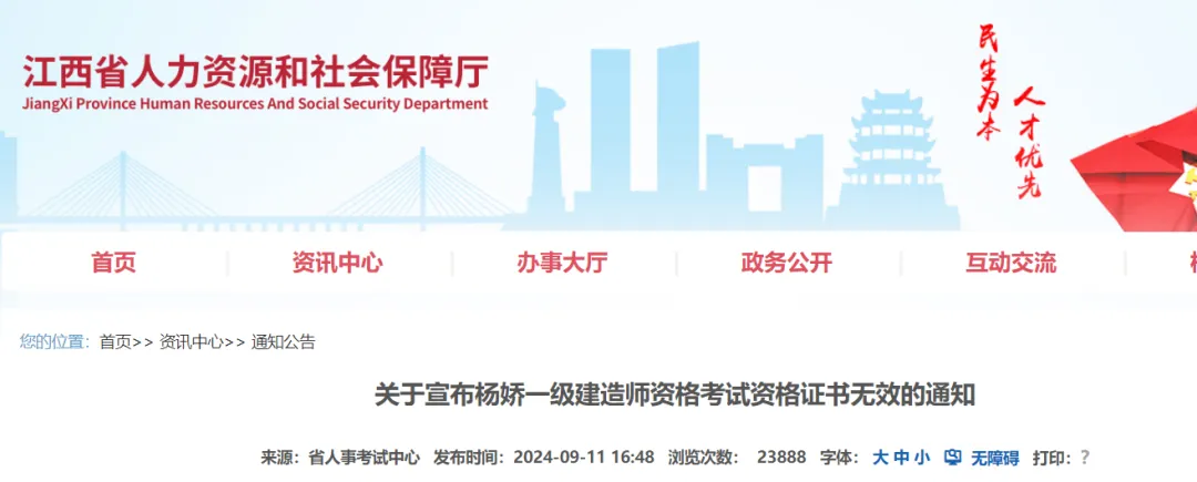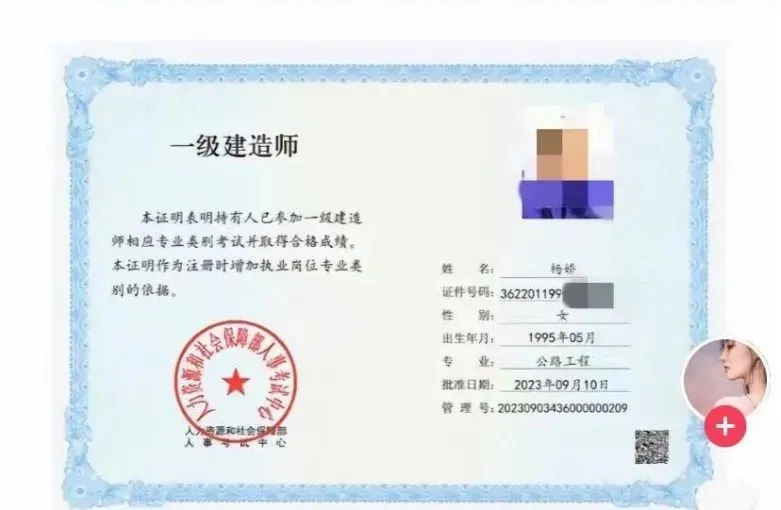 2024年9月,江西省人社厅发布一则官方通知,宣布考生杨娇因提供虚假证明材料,所取得的一级建造师资格证书(建筑专业)以及市政、公路增项证书全部作废!