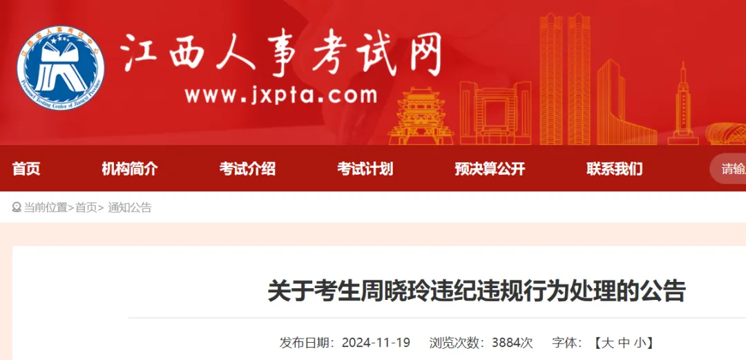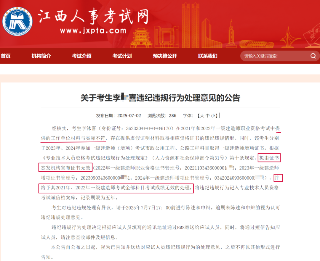 2024年11月19日,江西人事考试网发布通知,取消了考生周晓玲2020、2021、2022年一级建造师考试全部科目考试成绩。