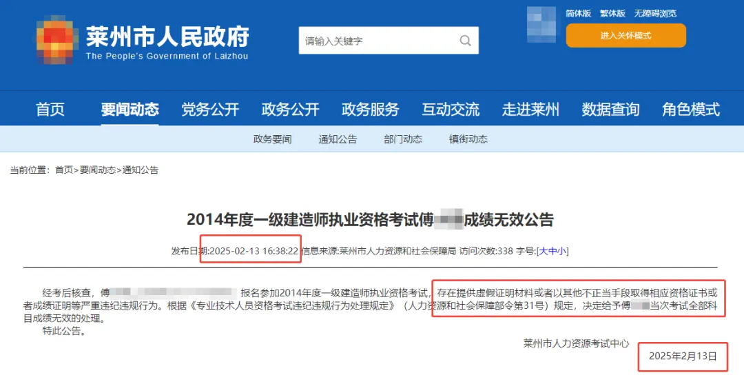 莱州市人民政府2025年2月13日发布《2014年度一级建造师执业资格考试傅**成绩无效公告》,傅**报名参加2014年一级建造师考试,存在提供虚假证明材料或者以其他不正当手段取得相应资格证书或者成绩证明等严重违纪违规行为,决定给予傅**当次考试全部科目成绩无效的处理。也就是说,她的一建证书,10年后无效了!
