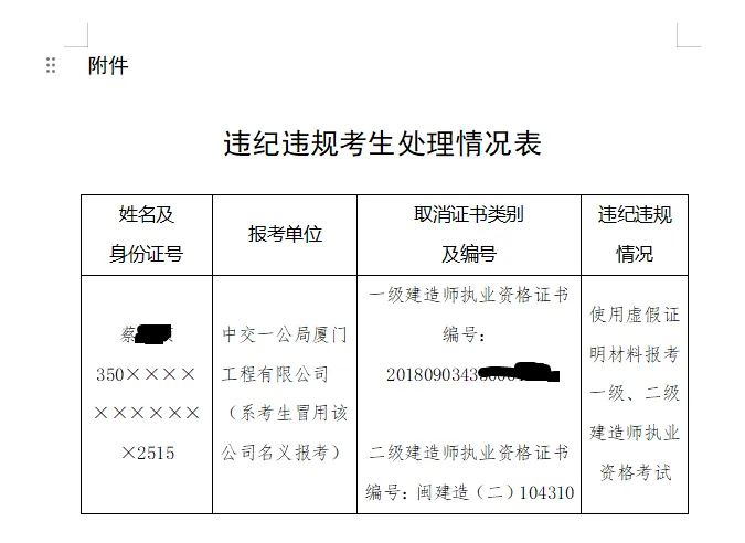据了解,蔡某某使用虚假证明材料报考一级、二级建造师执业资格考试的具体原因是冒用中交一公局厦门工程有限公司名义报名考试。